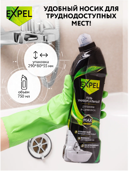 Баланс эффективности и безопасности геля достигается за счет применения лимонной кислоты. Благодаря своим свойствам эта природная кислота отлично очищает загрязнения и абсолютно безопасна для эмали и металлических поверхностей. Универсальный гель Expel подходит для всех типов поверхностей: