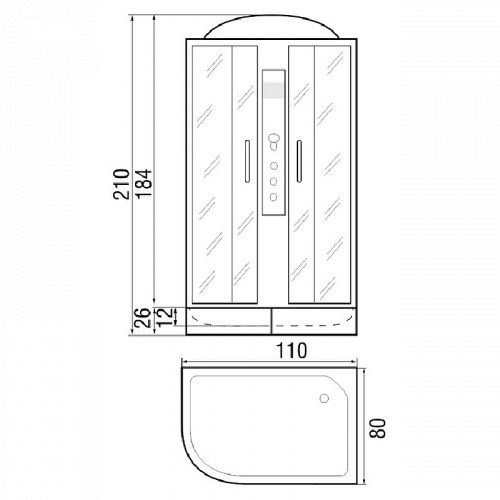 ~ крыша ~ верхний душ ~ вентиляц. отв-я(2шт) ~ центр.стойка ~ смеситель с переключ. режимов. ~ 3 г/м форс. ~ штанга ~ ручной душ 3х режимн. ~ полочка ~ зеркало ~ поддон п/кр. низ.с/съем. экр.(Н=26см) ~ сифон