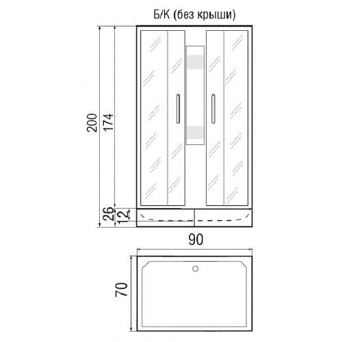 ~ без крыши ~ центр.стойка ~ штанга для верхнего и ручного душа ~ ручной душ 3-х позиц. ~ смеситель ~ полочка ~ зеркало ~ поддон кв.низ со съемн.экр. (Н=26см) ~ сифон Высота при одетом верхнем душе 215 см