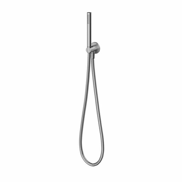 Ручной душ из нержавеющей стали, в комплект входит шланг из нержавеющей стали, держатель и выход для подачи воды. Сочетается с кнопочным смесителем ETERNA.