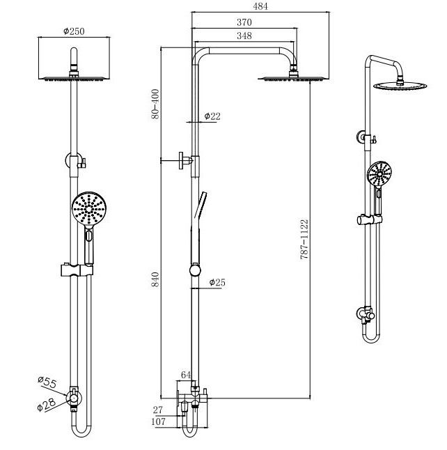 • регулируемая душевая штанга из нержавеющей стали, выдвигающаяся до 1122 мм в высоту