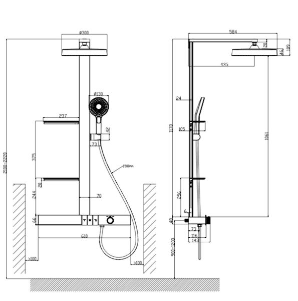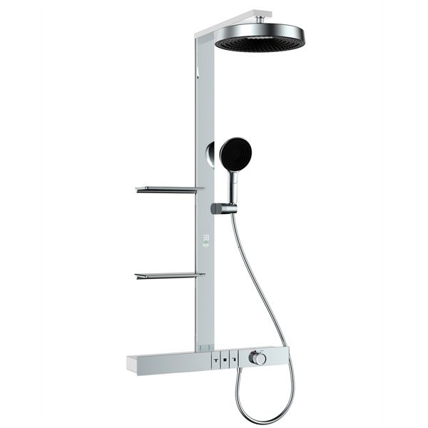 LED дисплей (индикация температуры и времени) на душевой штанге, две полочки из закалённого стекла (237x105 мм).