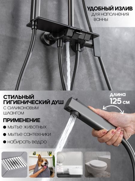 Душевой гарнитур с тропическим и гигиеническим душем Vexorus имеет возможность установки на любую поверхность. Благодаря этому вы сможете использовать ее как в ванных комнатах, так и на даче. Матовый черный цвет придает изделию особую элегантность и шарм.