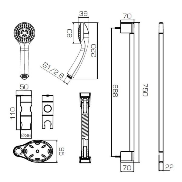 Струйные форсунки душа легко очищаются от известкового налета благодаря гибким силиконовым вставкам. Мобильный держатель позволяет закреплять ручной душ на любой высоте. Удобство создает мыльница, крепящаяся к штанге душа. ? штанга 22*750 мм,