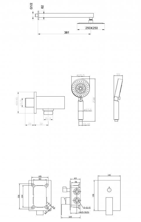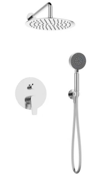 Оснащение: встраиваемый смеситель с переключателем на два выхода, верхний душ диаметр 25 см с изливом, ручной душ со шлангом, штуцером и держателем
