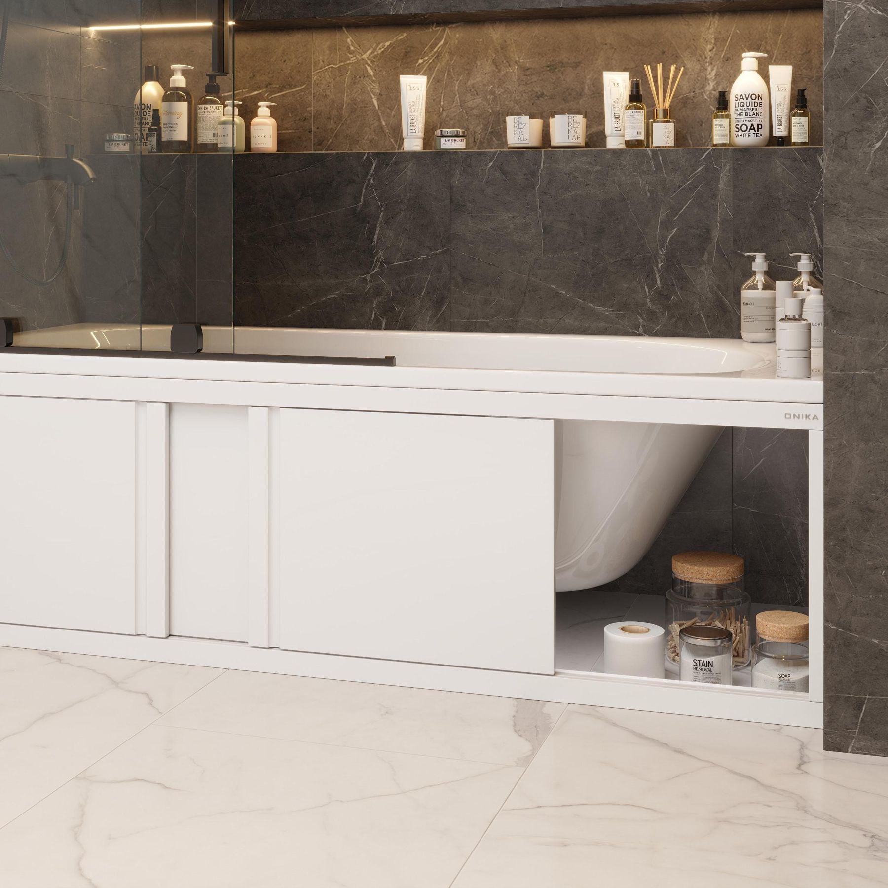 Универсальный экран под ванну 180 см Onika Одио скрывает все расположенные под ванной коммуникации и служит профилактикой скопления загрязнений под чашей ванны.