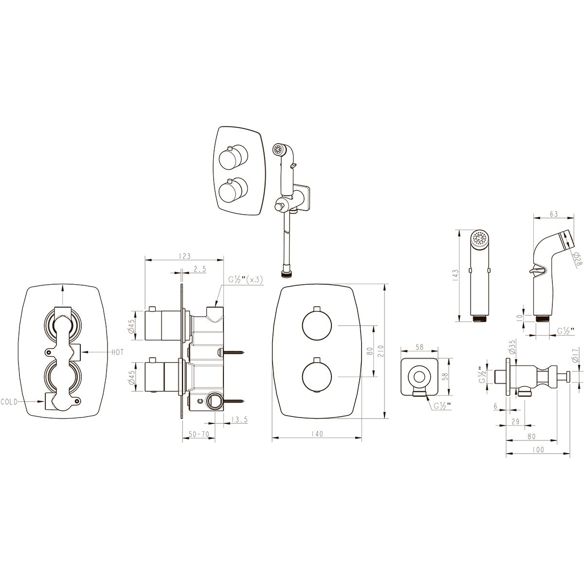 • Аксессуары в комплекте (лейка гигиенического душа с регулятором напора воды, шланг 1,2 м )