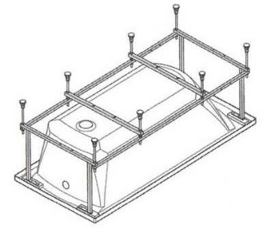 Усиленный цельносварной стальной каркас для ванны изготовлен из квадратного металлического профиля 2х2 см и окрашен темно-бронзовой молотковой краской. Каркас имеет 8 ножек и 4 опоры в борт ванны снизу. Предназначен для использования во влажных помещениях.