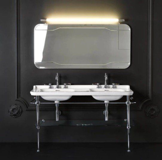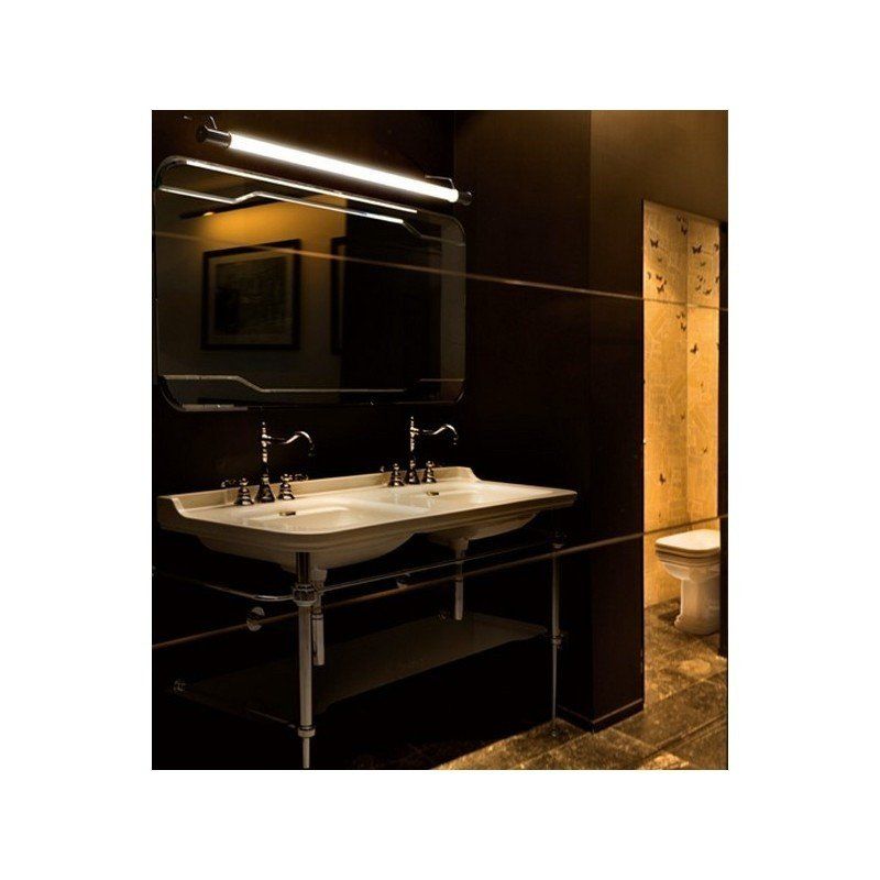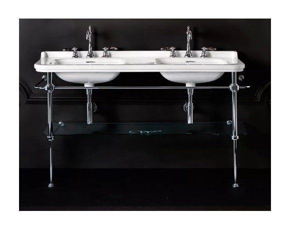 Консоль для раковины Kerasan Waldorf 919493 хромKerasan Waldorf 9195K1 Консоль для раковины на 150 см. Металлическая структура для раковины 150 см, со стеклянной полочкой, цвет хром (из 2-х коробок: арт. 919590+920290 и 919801). Подходит к 4143K1 раковина керамическая двойная 150х55 см, c 1 отверстием под смеситель на чашу, белая, заглушка перелива - хром.