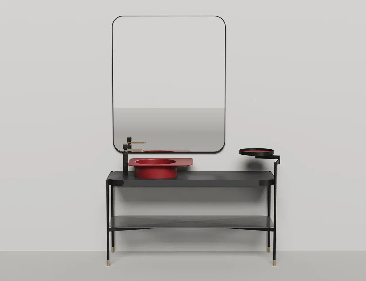 Каркас из чёрного металла с отделкой из латуни дополнен столешницей из материала S-Stone и полкой из рифлёного стекла, напоминающего поверхность водной глади. Зеркало в скоординированном дизайне создаёт законченный образ.
