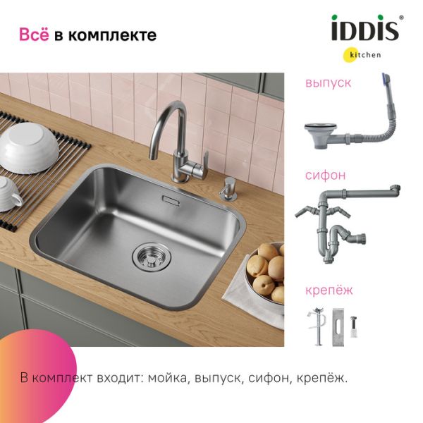 Идеально сочетается по цвету со смесителями IDDIS® ACEBNFFi05, RULSTLFi05, RULSTL0i05, K05STJ0i05, CUBSTP0i05, K05STL0i05, PURBNPFi05, GRABNFLi05. Гарантия на мойки IDDIS® – 15 лет, на выпуск, крепления и сифон – 1 год. В зависимости от партии внешний вид мойки и его комплектация могут незначительно отличаться.