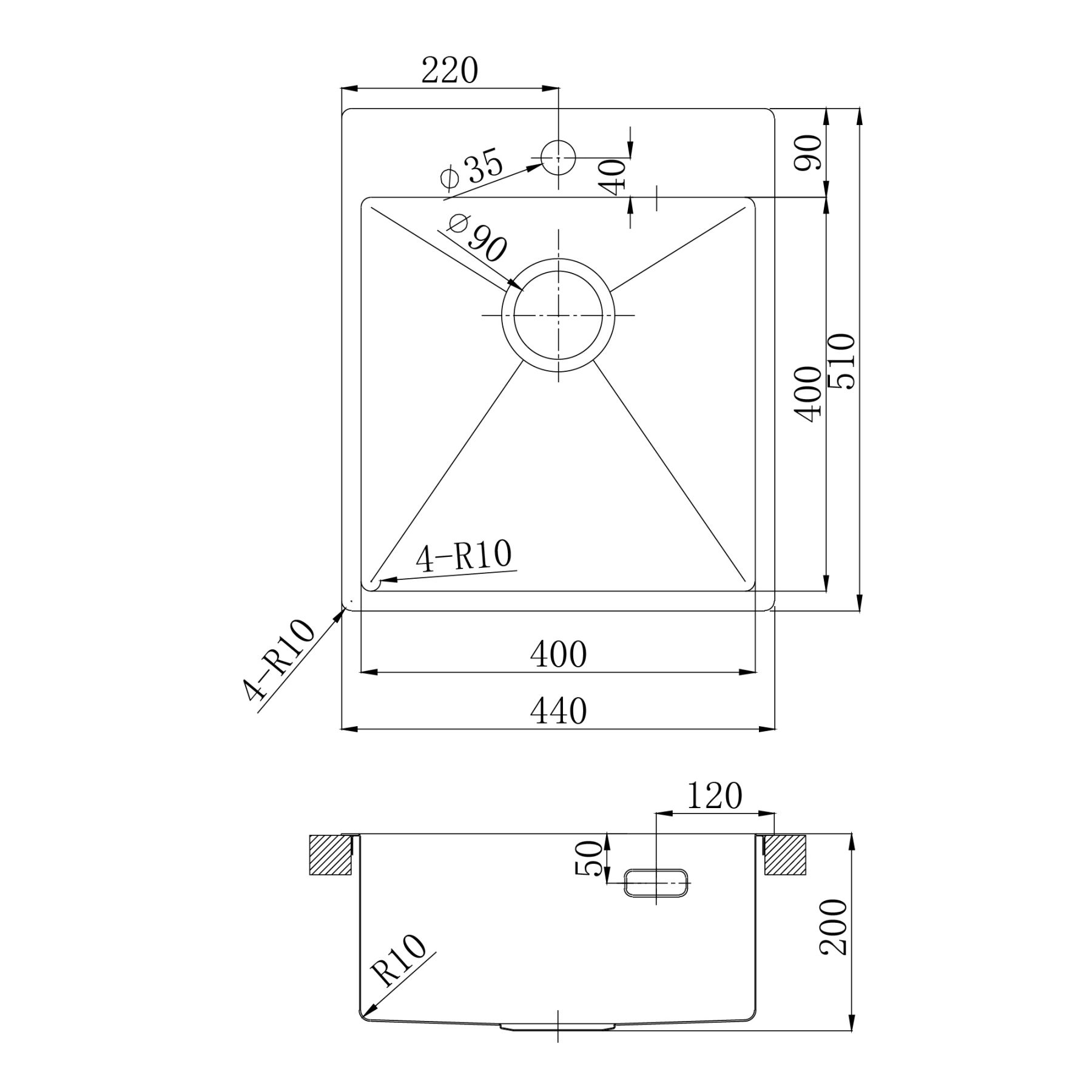 • Сливная арматура с выпуском 3 ½ (D-90мм) и сифон с возможностью подключения посудомоечной и стиральной машины