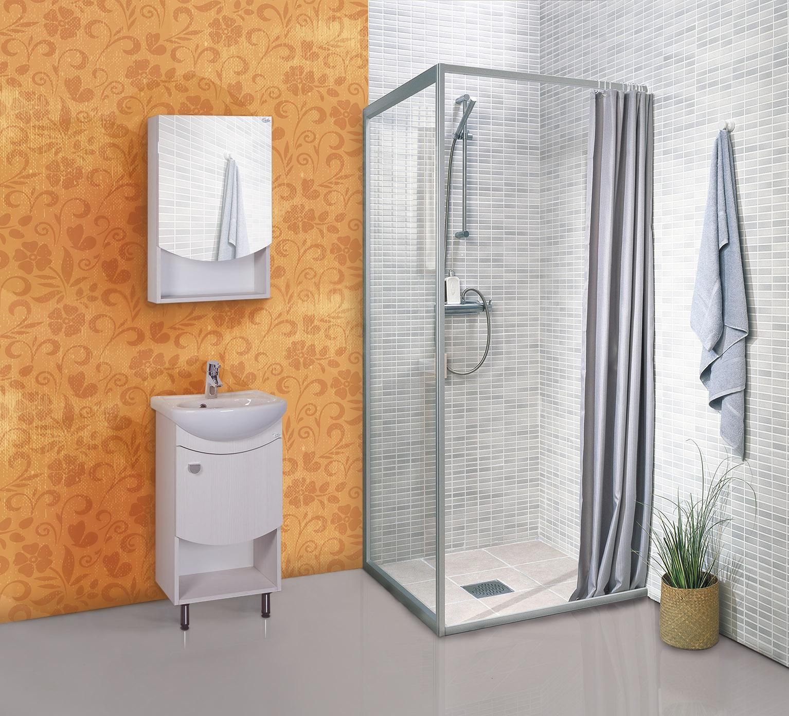 Открытая полка обеспечит быстрый доступ к часто используемым аксессуарам, а пространство за распашной дверцей с системой плавного закрывания станет удобным местом для хранения различных бытовых принадлежностей.