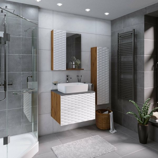 Подвесной пенал Альба- 30 смБелый матовый цвет с 3D рисунком безупречно сочетается с фактурой под дерево и позволяет пеналу органично вписаться в интерьер ванной комнаты.