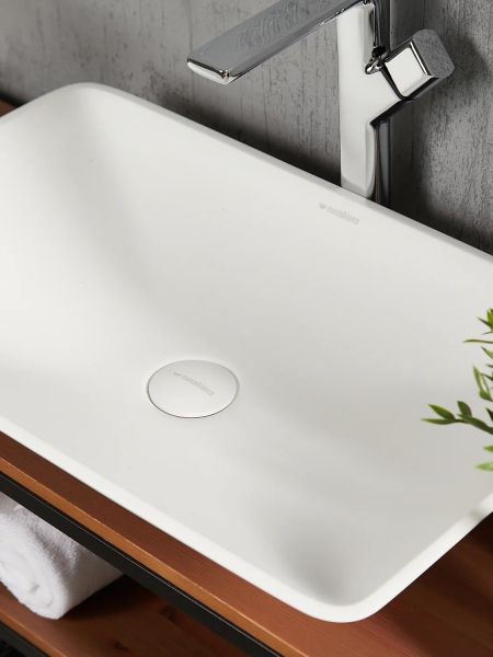 Раковина из искусственного камня для ванной комнаты. Легкая и «воздушная». Востребованной прямоугольной формы. Устанавливается на поверхность столешницы или мебели сверху накладным способом. Дно чаши не плоское, вода по стенкам беспрепятственно стекает в сливное отверстие до последней капли – вода не застаивается после активного использования.Stelvio Quattro имеет матовую, бархатистую поверхность. Полимерный материал принимает температуру окружающей среды, поэтому в жилом пространстве данная модель раковины всегда будет приятной на ощупь.Уход за раковиной из искусственного камня прост: в большинстве случаев достаточно протереть поверхность влажной губкой с чистящим средством. Материал не впитывает влагу, не порист, непроницаем для плесени, бактерий и грибков.