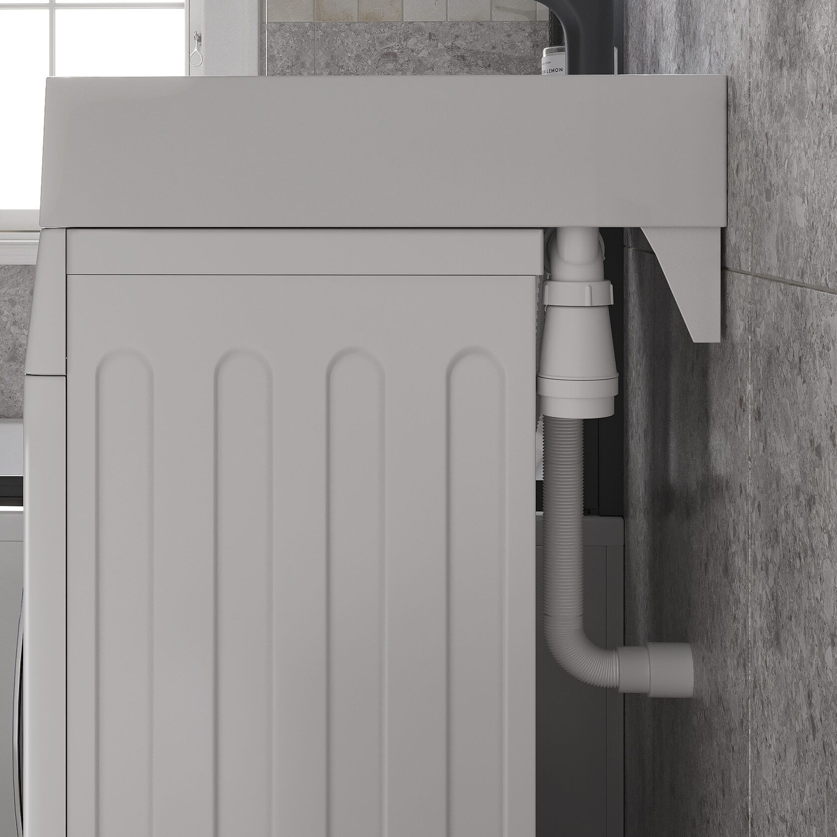 Раковина Reflexion Tetra спроектирована специально для установки над стиральной машинкой. Она имеет неглубокую чашу и горизонтальный слив. Благодаря ему умывальник из искусственного мрамора для ванной комнаты отводит воду в сифон, который проходит позади стиральной машины. Это защищает технику от случайных утечек.