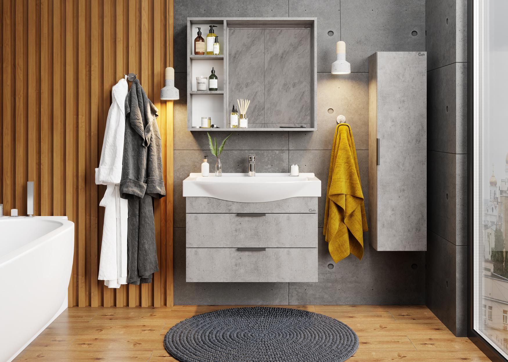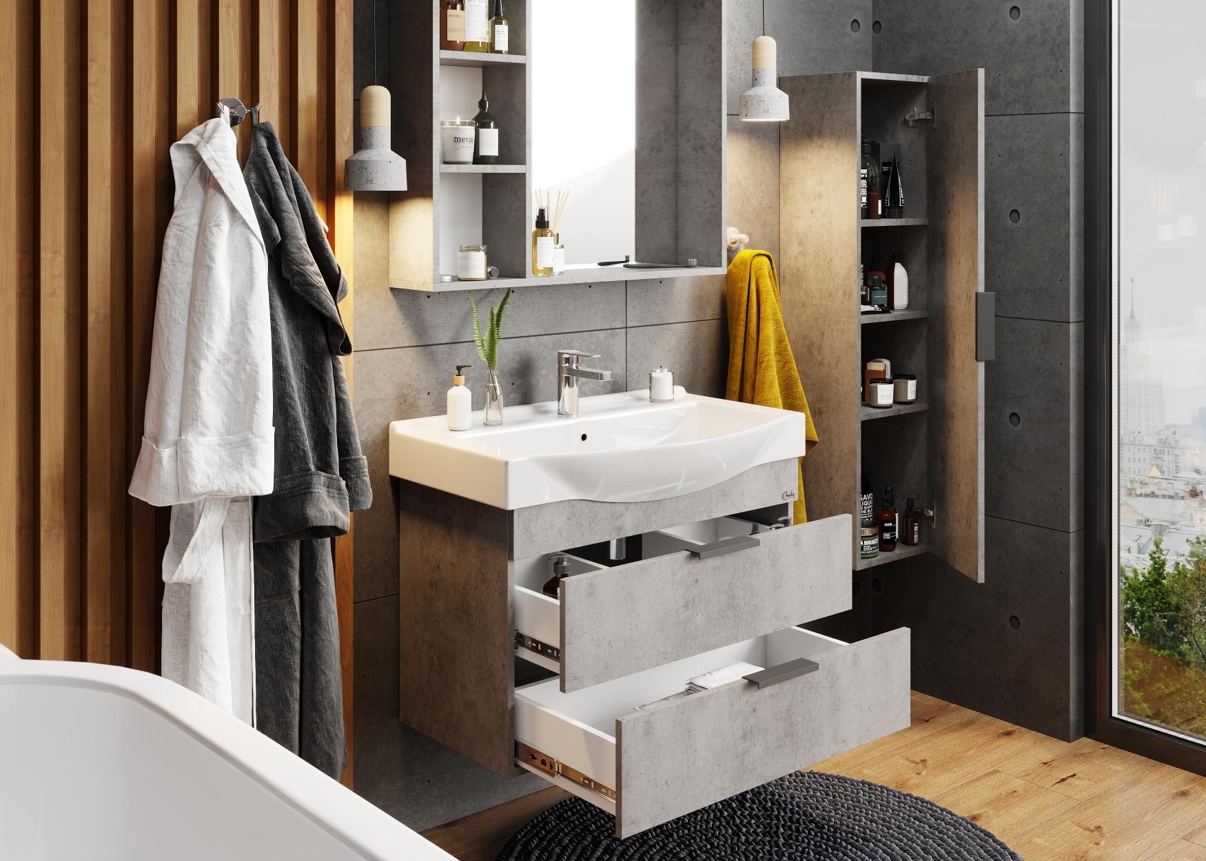 Навесной зеркальный шкаф для ванной комнаты Onika ДЕВИС 80 отличается чёткой геометрией форм и создан для тех, кто ценит современный лаконичный дизайн, холодный брутальный эффект бетона, а также безупречное исполнение.