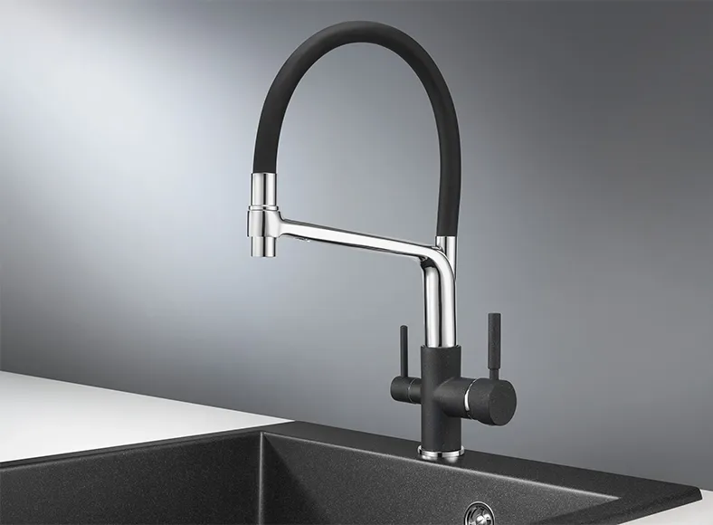 Смеситель для кухни. Цвет-черный. В комплект поставки входит: смеситель, гибкая подводка, комплект креплений, переходник для подключения фильтра с питьевой водой
