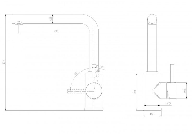 Ручка управления горячей и холодной водой имеет углы открытия 10° к стене и 90° от стены, что позволяет устанавливать смеситель максимально близко к стене.