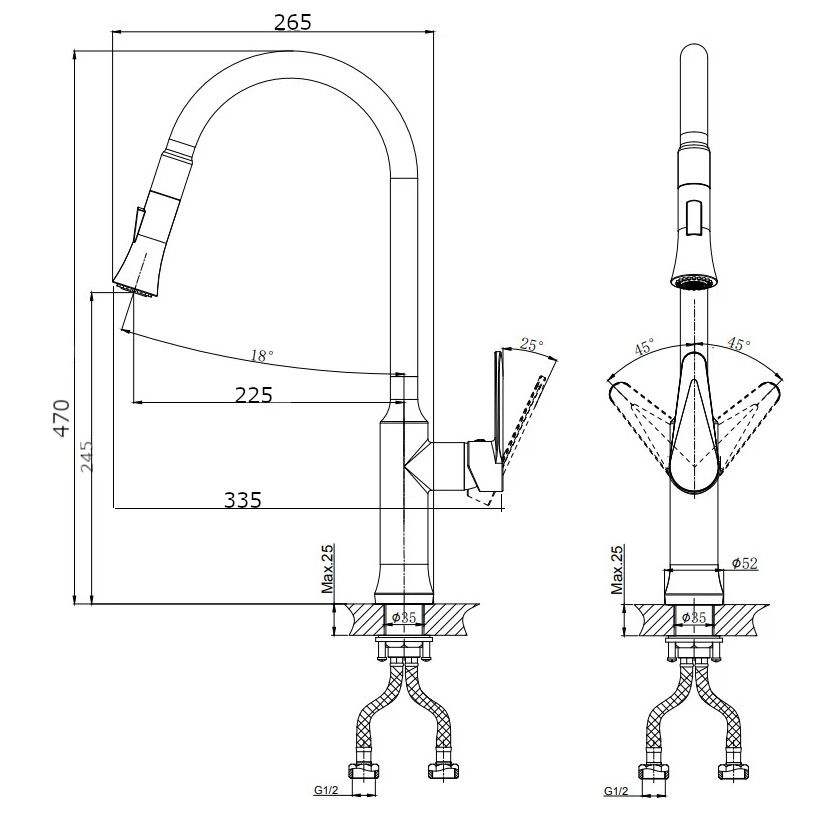 Смеситель для кухни RUSH арт. DN0335-23 с поворотным изливом и вытяжной лейкой из коллекции Denis с металлической ручкой, изготовлен из высококачественной латуни и имеет рычажное управление.В смеситель установлен картридж D-35 с керамическими пластинами. Высота смесителя 486 мм. Излив поворотный 225 мм. Высота излива до аэратора 245 мм. Аэратор изготовлен из пластика с нержавеющим корпусом, угол наклона аэратора-18гр.В комплекте универсальная присоединительная группа для установки на горизонтальную поверхность, гибкая подводка с латунными гайками 40 см - 2шт, фум-лента, индивидуальный пакет, паспорт, гарантийный талон.