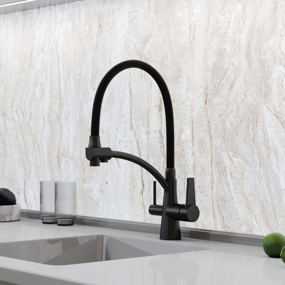 Смеситель для кухни SANCOS Eri с гибким изливом и возможностью подключения фильтра для воды, цвет матовый черный, арт. SC4001MBС возможностью регулировки температуры водыАэратор, гибкая подводка, ключ и крепления для монтажа, ключ для обслуживания аэратора
