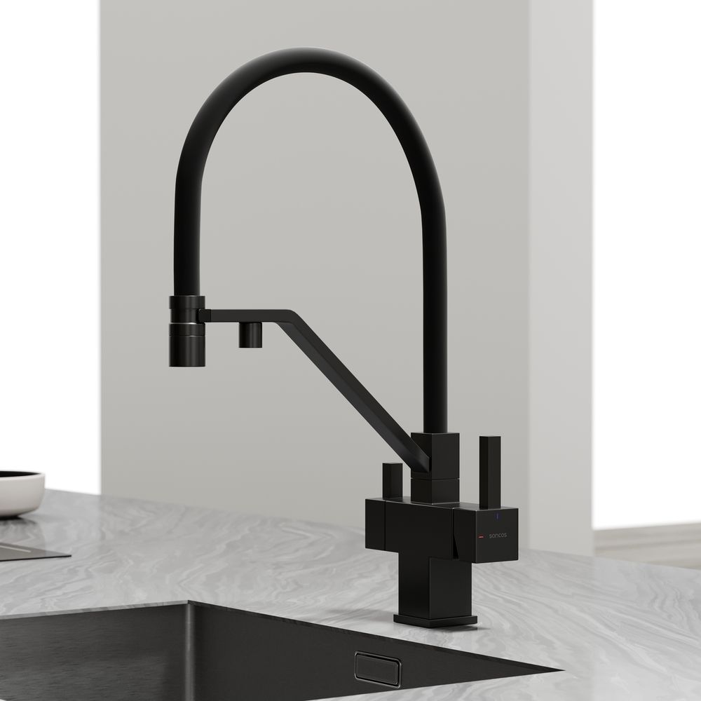 Смеситель для кухни SANCOS Loro с гибким изливом и возможностью подключения фильтра для воды, цвет матовый черный, арт. SC4007MBФункция "Холодный старт" - при включении смесителя активируется холодной поток, для экономии горячей водыАэратор, гибкая подводка, ключ и крепления для монтажа