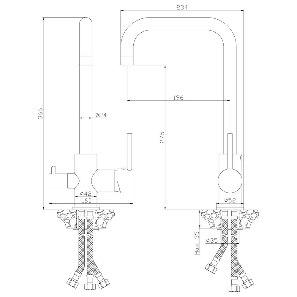 Смеситель для кухни Rossinka Z Z35-29 с подключением к фильтру с питьевой водой, пластиковый аэратор с функцией легкой очистки, керамический картридж 35 мм, керамическая вентильная головка, гибкая подводка 35 см – 3 шт, присоединительная группа для горизонтального крепления, переходник для подключения шланга от фильтра с питьевой водой, металлические рукоятки.