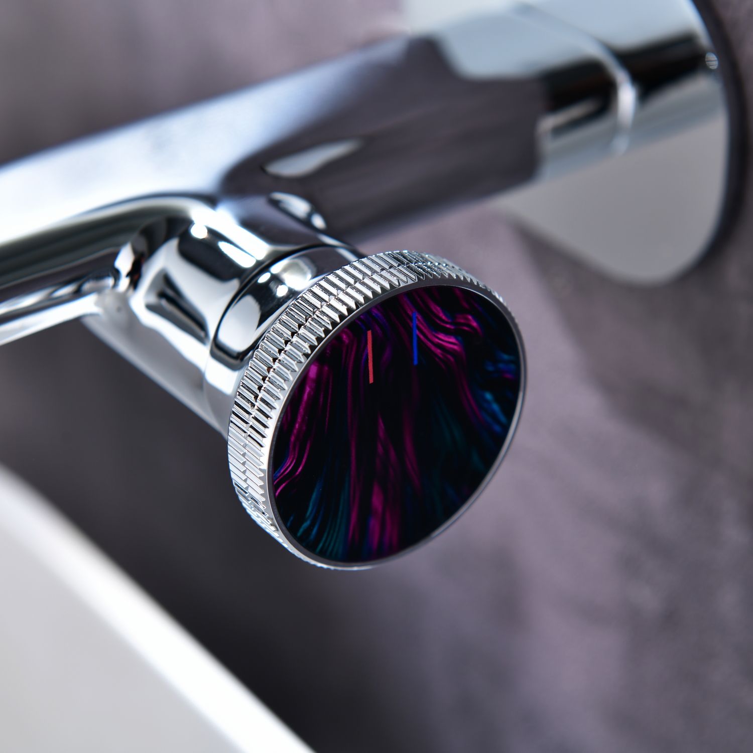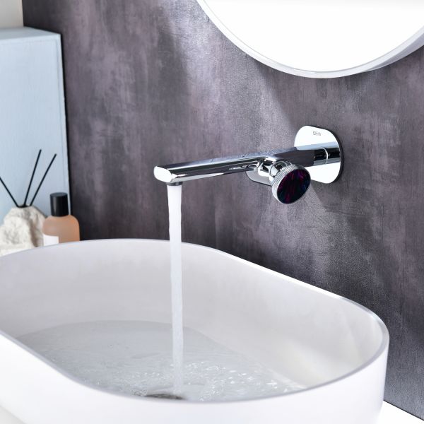 Смеситель для раковины настенного монтажа датского производителя Black&White в цвете глянцевый хром. Наружная и внутренняя часть изделия изготовлена из сантехнической латуни марки HPB 59-  ресурсный и безопасный для Вашего здоровья сплав. Для управления потоками воды и настройки температуры установлен прогрессивный керамический картридж с ручкой в форме диска с насечками, украшенный цветным элементом. В дизайне корпуса пересекаются плавные линии простых геометрических фигур, что гармонично выписывается в современные и классические интерьеры.