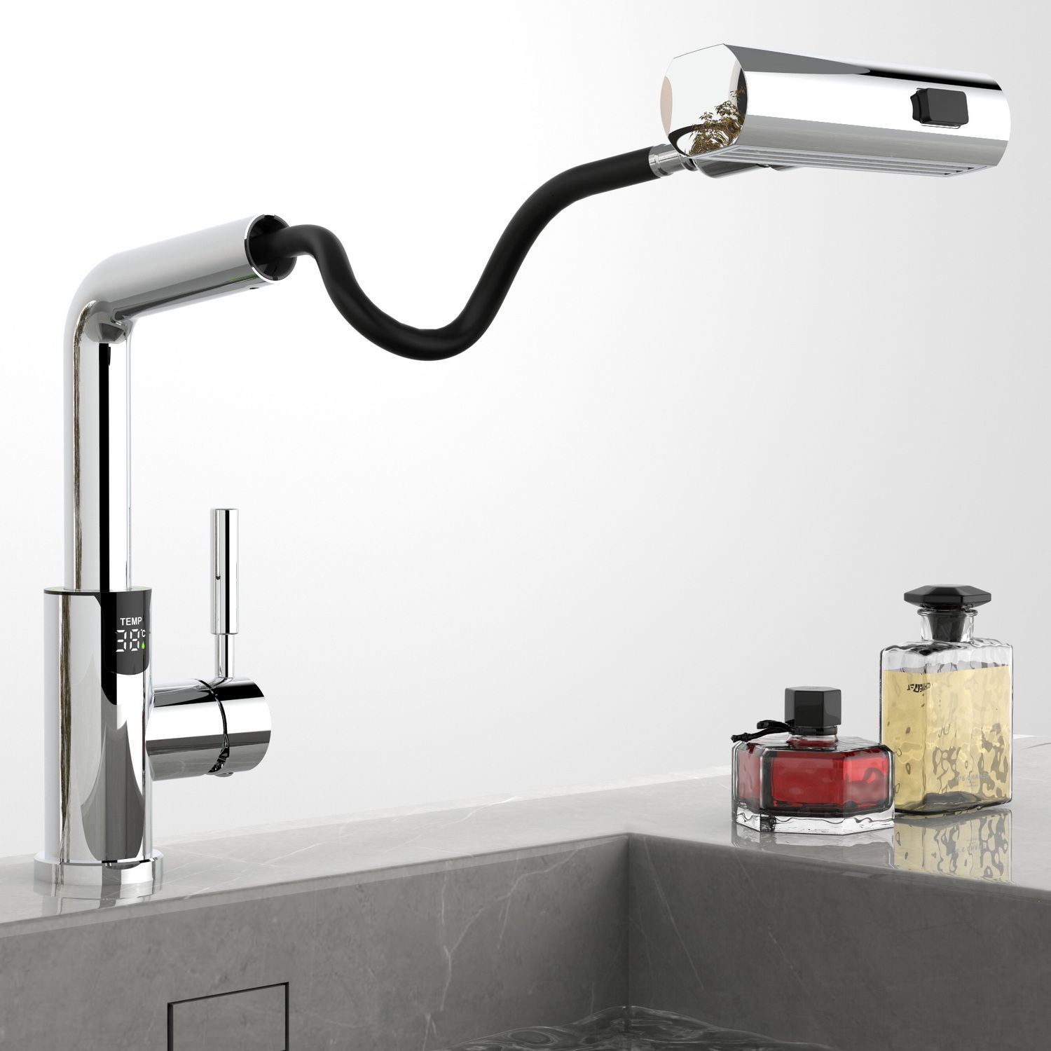 Смеситель для раковины датского производителя Black&White в цвете хром. В корпусе изделия прослеживаются нотки классических форм и современного стиля. Изготавливается из сантехнической латуни для увеличенного запаса прочности и исключения вероятности появление коррозии. Управление потоком воды осуществляется с помощью керамического картриджа повышенной пропускной способности. Инновационным решением можно отметить электронное табло, расположенное в нижней части корпуса, на которое выводится показание температуры воды с подсветкой красного, зеленого и синего цвета. В данном продукте реализован многофункциональный излив с возможностью настройки высоты и длинны с помощью вытяжного шланга. Аэратор смесителя оборудован несколькими видами подачи воды, которые переключаются с помощью кнопки расположенной сверху корпуса.