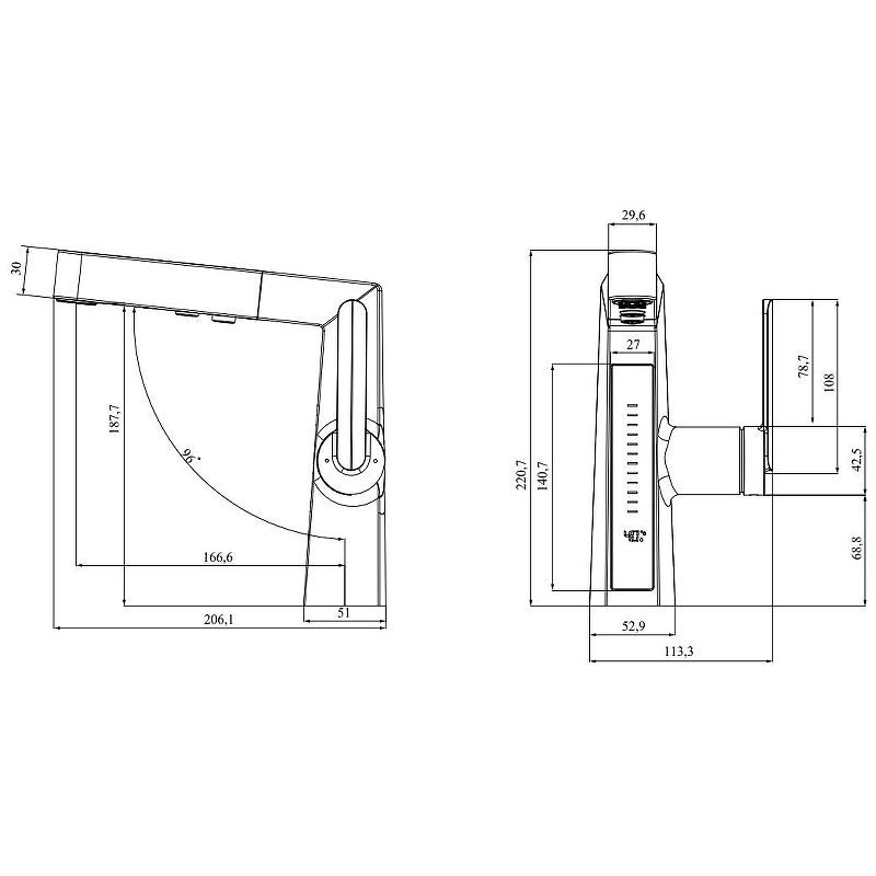 Смеситель датского производителя Black&White в черном матовом цвете. Изделие реализовано в минималистичном дизайне и изготовлено из сантехнической латуни, что увеличивает срок службы и исключает возможность появления коррозии. В нижней части корпуса расположен дисплей с показаниями температуры воды с соответствующей подсветкой температурного режима. Для его работы не требуется электричество- он работает от машины постоянного тока, при прохождении через него потоков воды. Управление происходит через керамический картридж большой пропускной способности. Важным функциональным элементом можно отметить вытяжной излив с поворотным аэратором, на котором также дополнительно есть функция изменения поток воды.