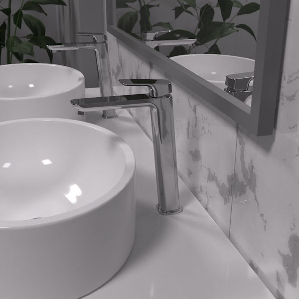 Авторская коллекция итальянского дизайнера Mirko Bosio - Nove. Смеситель коллекции Nove выполнен в акцентной геометрической форме, что можно отнести как к нестандартному конструктивному решению, так и к элементу шика. Широкая ручка рычага элегантно сочетается с квадратным корпусом. Дизайн однорычажного высокого смесителя поддержит скандинавский стиль оформления ванной комнаты или любое иное, выбранное вами, направление минимализма. Благодаря высокому корпусу смеситель Nove идеально сочетается с накладными глубокими раковинами-чашами различного размера, а так же подойдет для использования на широких встроенных и подвесных раковинах.