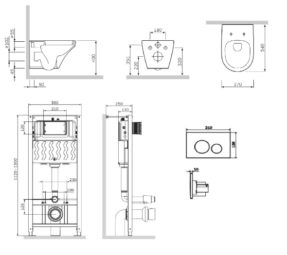 Полностью готовый к установке комплект: система инсталляции с клавишей, подвесной унитаз сиденьем.Не разборная рама из стального профиля выдерживает нагрузку до