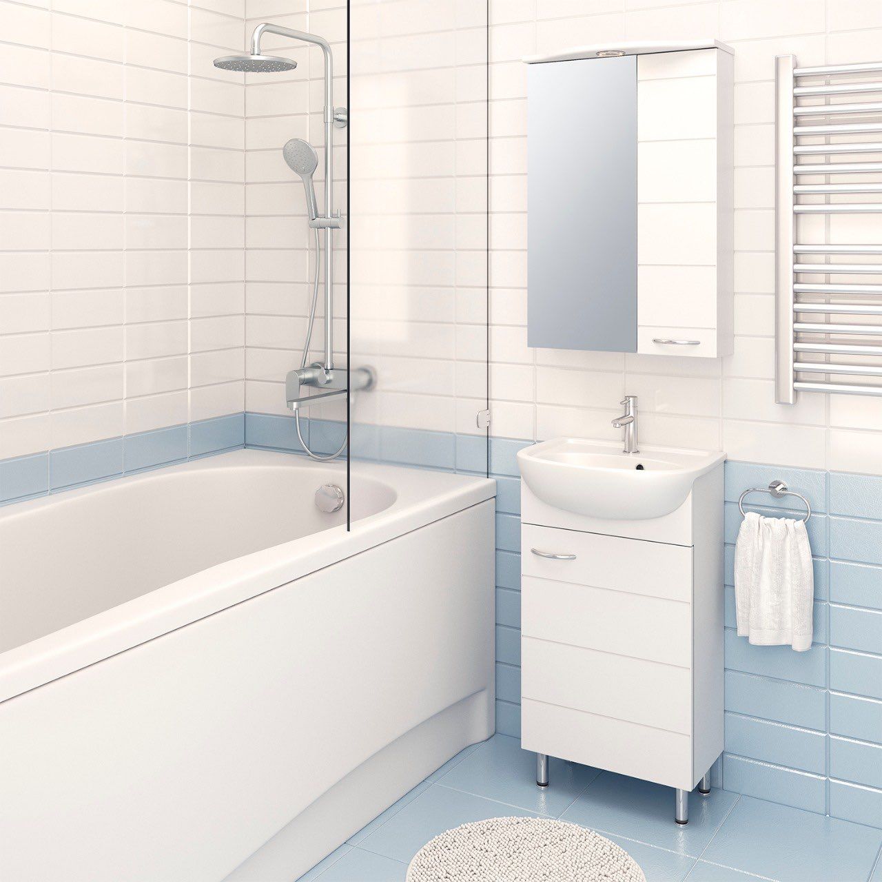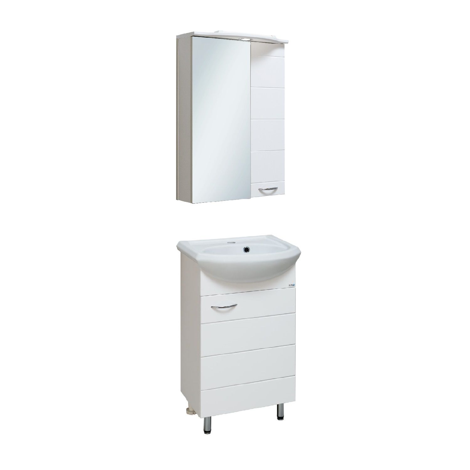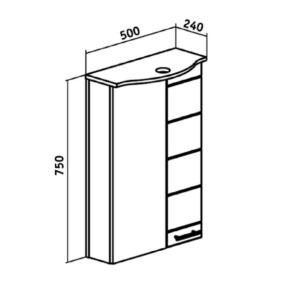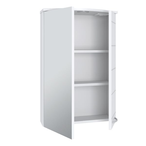 Зеркальный шкаф оборудован одним врезным светодиодным светильником и розеткой с выключателем. Шкаф с двумя отделениями: справа - с белой дверкой, слева - с зеркальной. В каждом отделении - по две внутренние полки. Петли со встроенным доводчиком, ручка -1 шт. Выпускается только в правом исполнении.