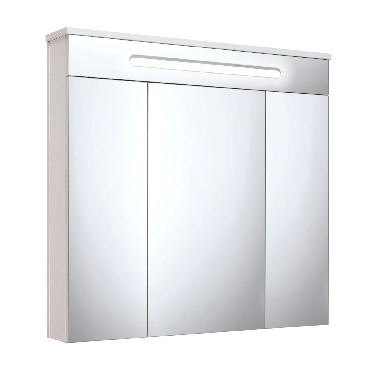 Зеркальный шкаф со встроенной сверху люминесцентной подсветкой и тремя отделениями с зеркальными фасадами. Внутри - две встроенные полки. Блок розетка/выключатель расположен внутри шкафа. Петли со встроенным доводчиком.