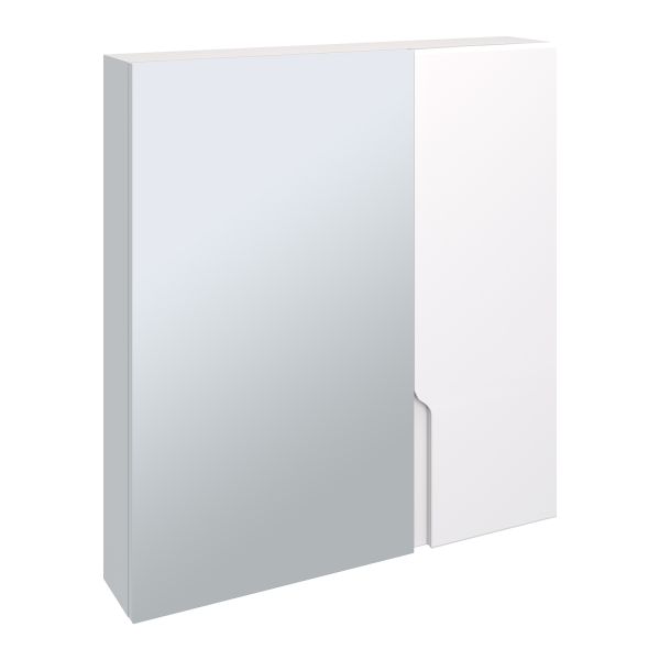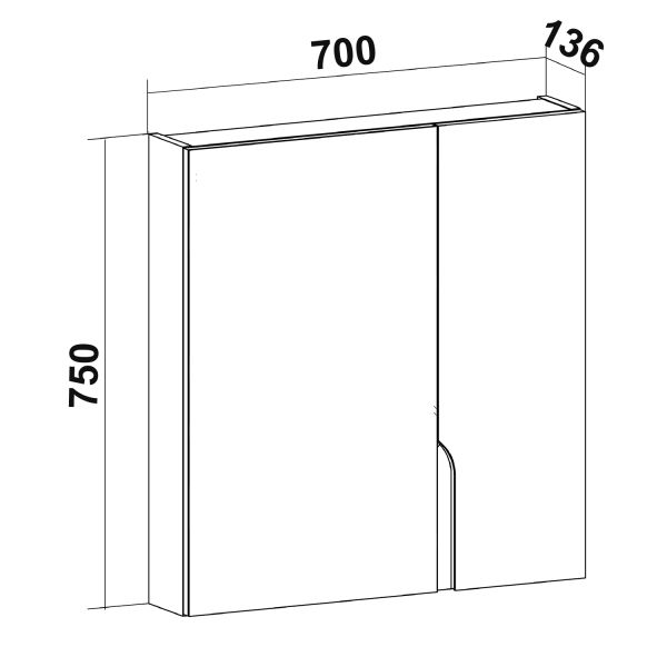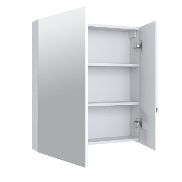 Зеркальный шкаф без подсветки c двумя ассиметричными дверками, одна из которых зеркальная, а вторая - белая. Внутри шкафа - две горизонтальные  полки.  Петли со встроенным доводчиком.