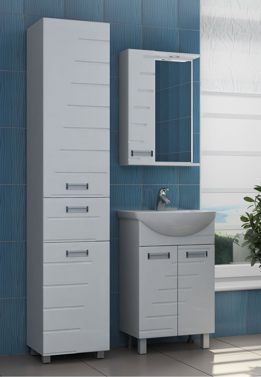 1 дверца; 2 полки ЛДСП, 1 светодиодный светильник, включатель с розеткой; ручка врезная металлическая хромированная.